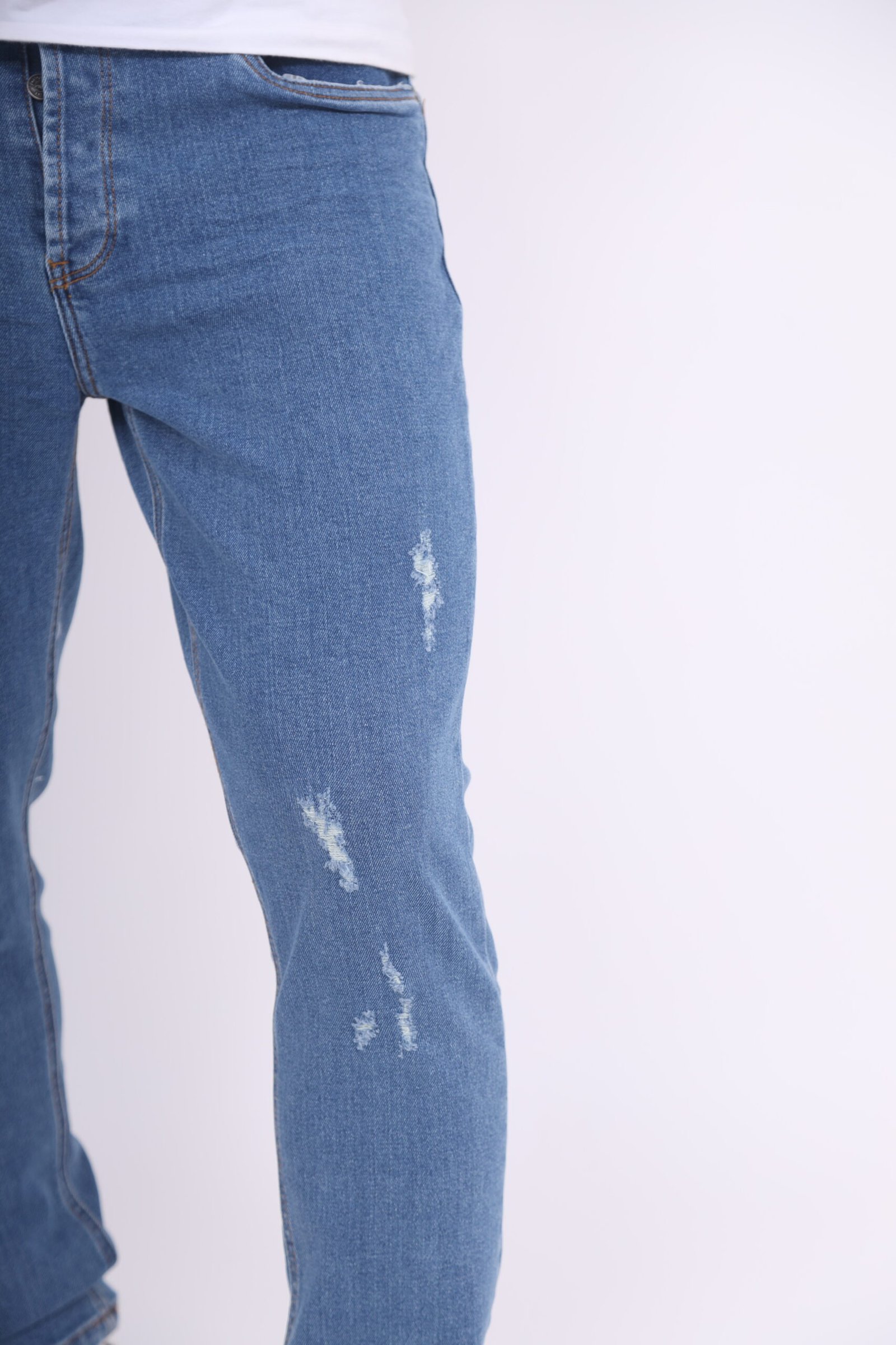 Jean taille normal à cinq poches. Effet délavé. Fermeture à l’avant par zip et bouton.